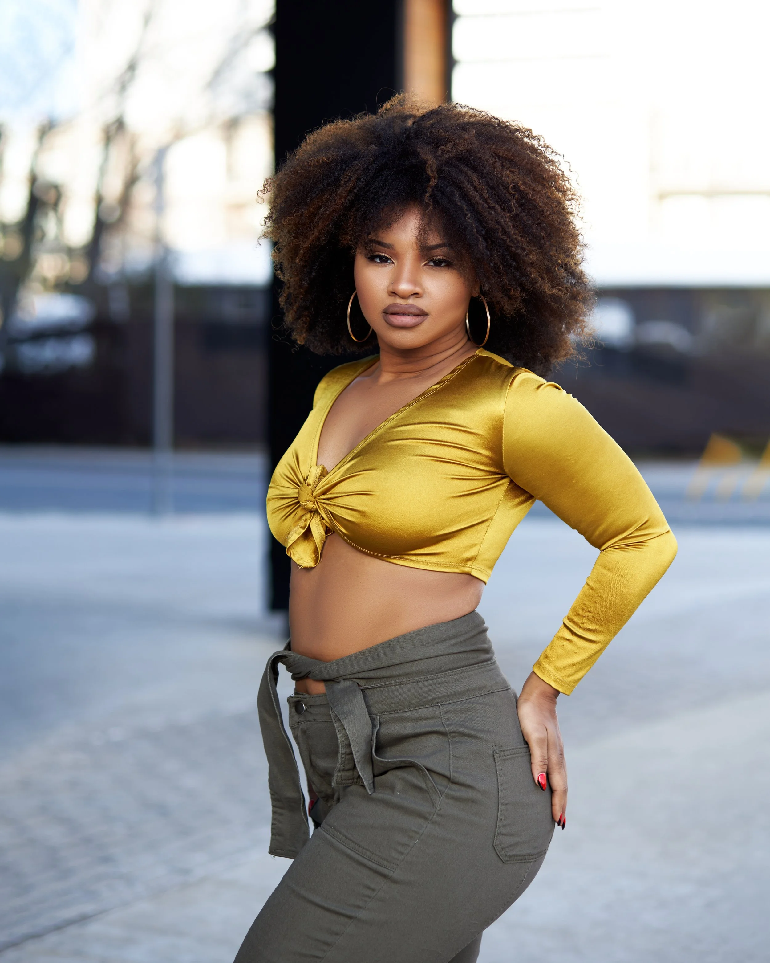 A woman with an afro hairstyle wearing a yellow crop top, beige pants, and leopard print high heels posing outdoors on a sidewalk next to a building and a railing.