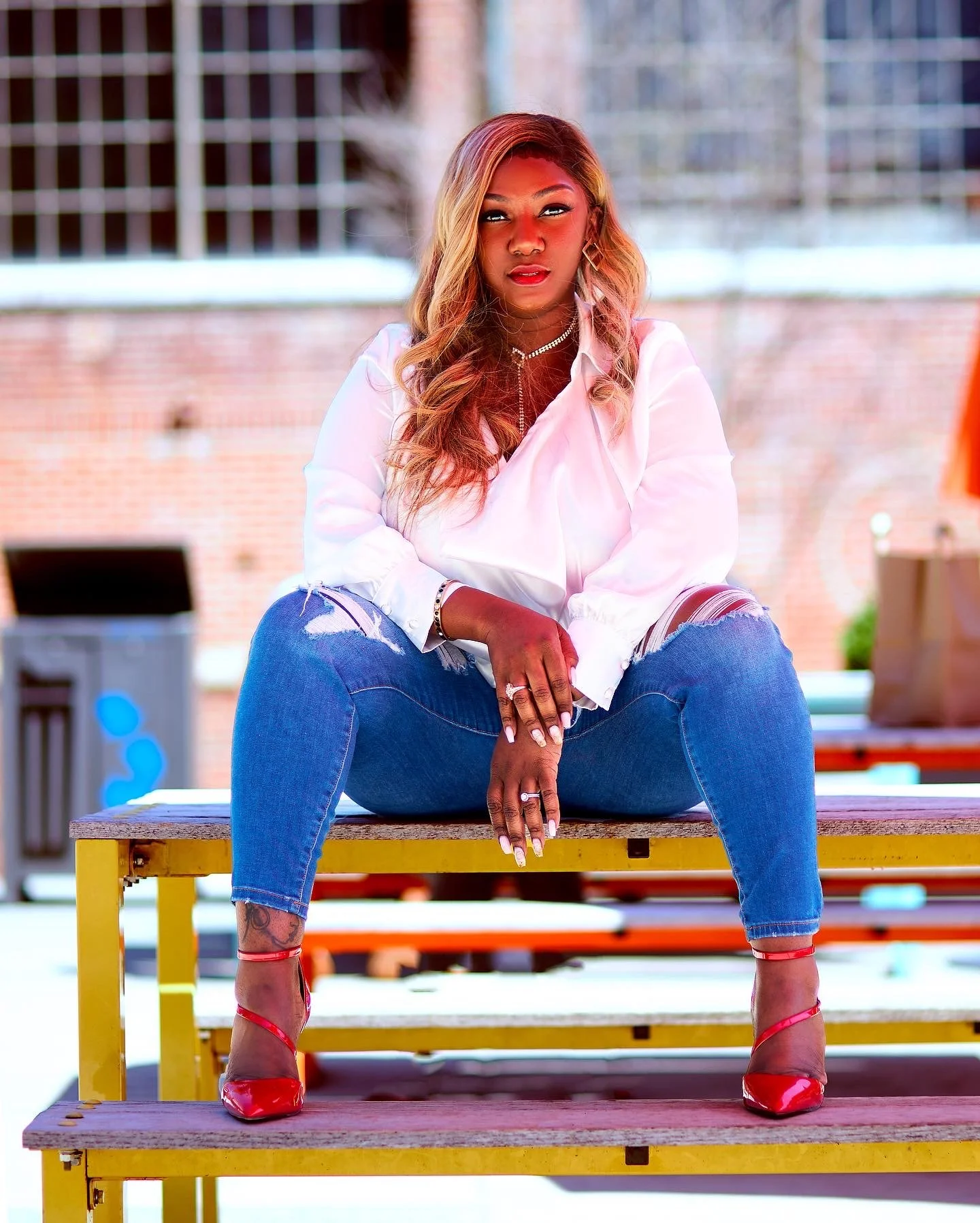 A woman sitting on a yellow picnic table outdoors, wearing a white blouse, ripped jeans, and red high heels, with long wavy blonde hair and jewelry.
