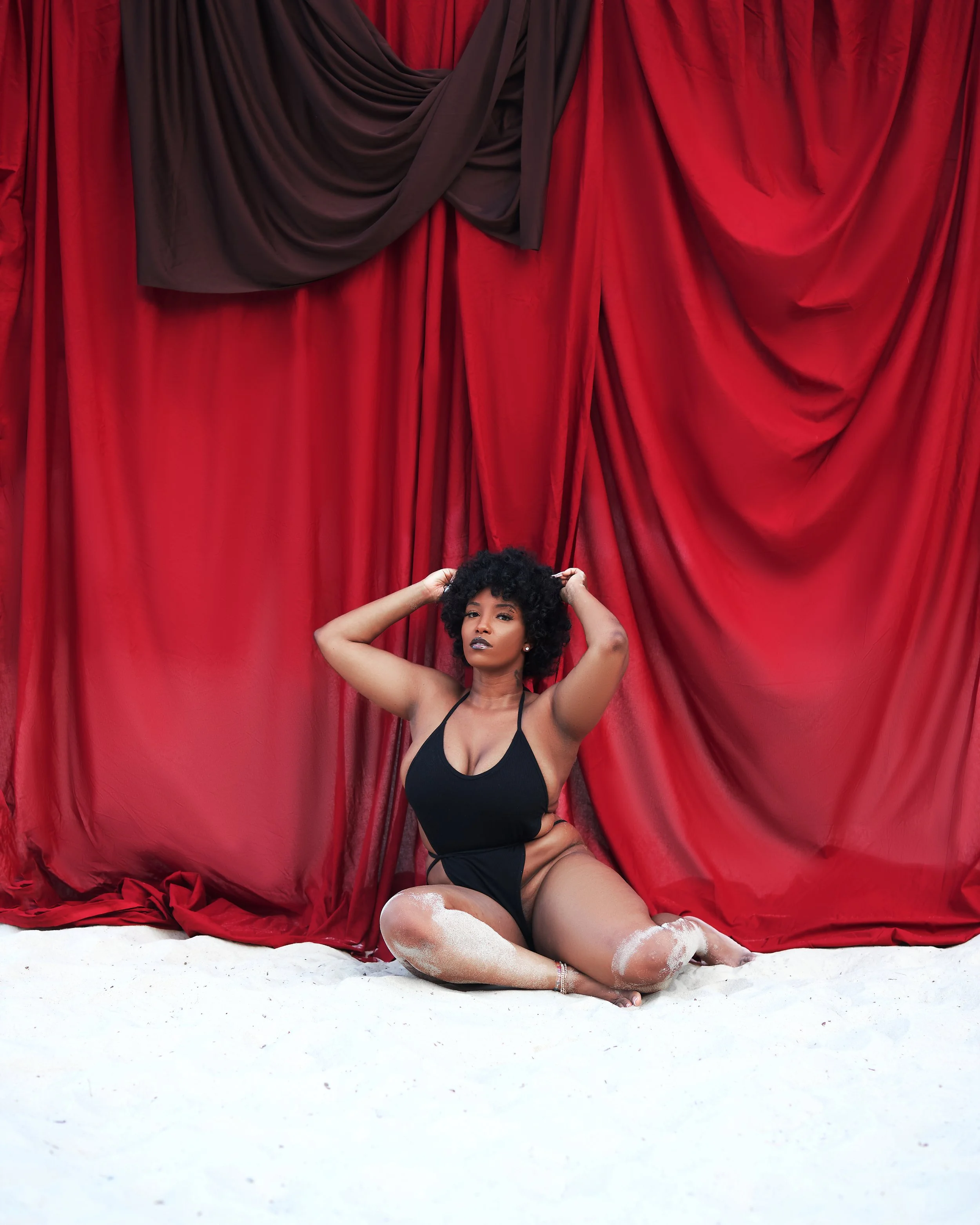 A woman sitting on sand in front of red and brown draped fabric, wearing black lingerie with dust on her knees and ankles.